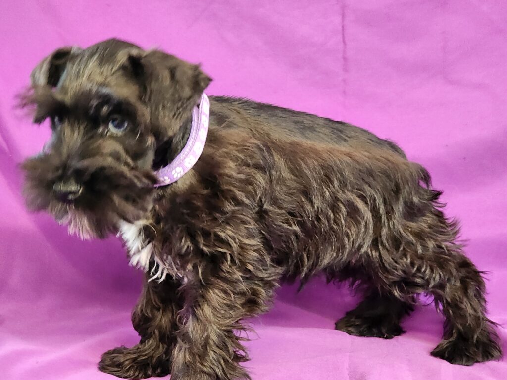 Black APRI registered, miniature Schnauzer. Super coat and floppy ears. Her ears are natural, and her tail has been done and dewclaws removed. Her suggested weight at maturity approx. 9lbs.