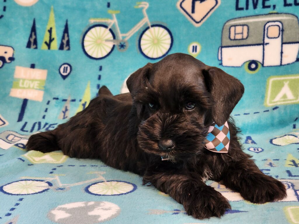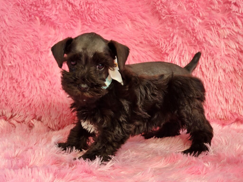 Beautiful black APRI registered, miniature Schnauzer male with blue eyes and white markings. This playful gorgeous boy is sure to steal your heart with his super coat and floppy ears.