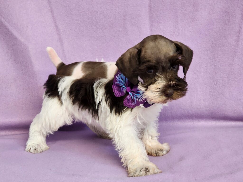 APRI registered chocolate and white parti. Her gorgeous little face has tons of puppy kisses and is sure to steal your heart. Ears are natural, and her tail has been done. Vac. current.