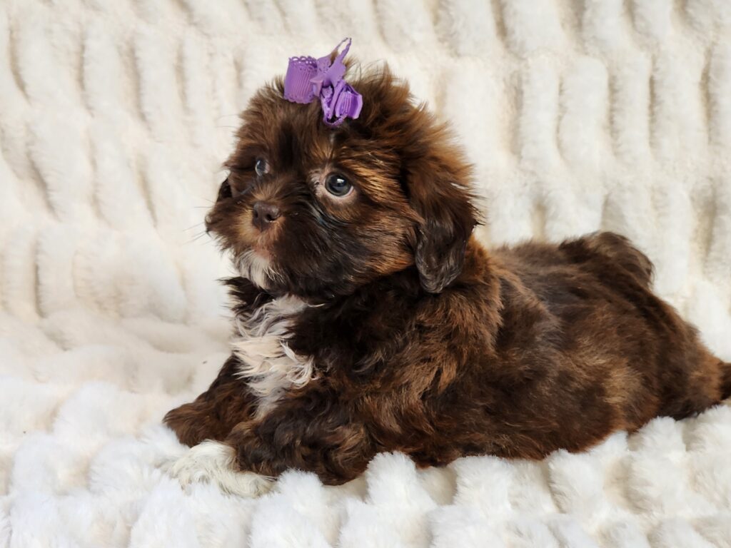 A beautiful chocolate and white gorgeous girl with her fluffy chocolate and white coat and purple bow. If you like puppy snuggles then she is for you. Vaccinations current and health guarantee.